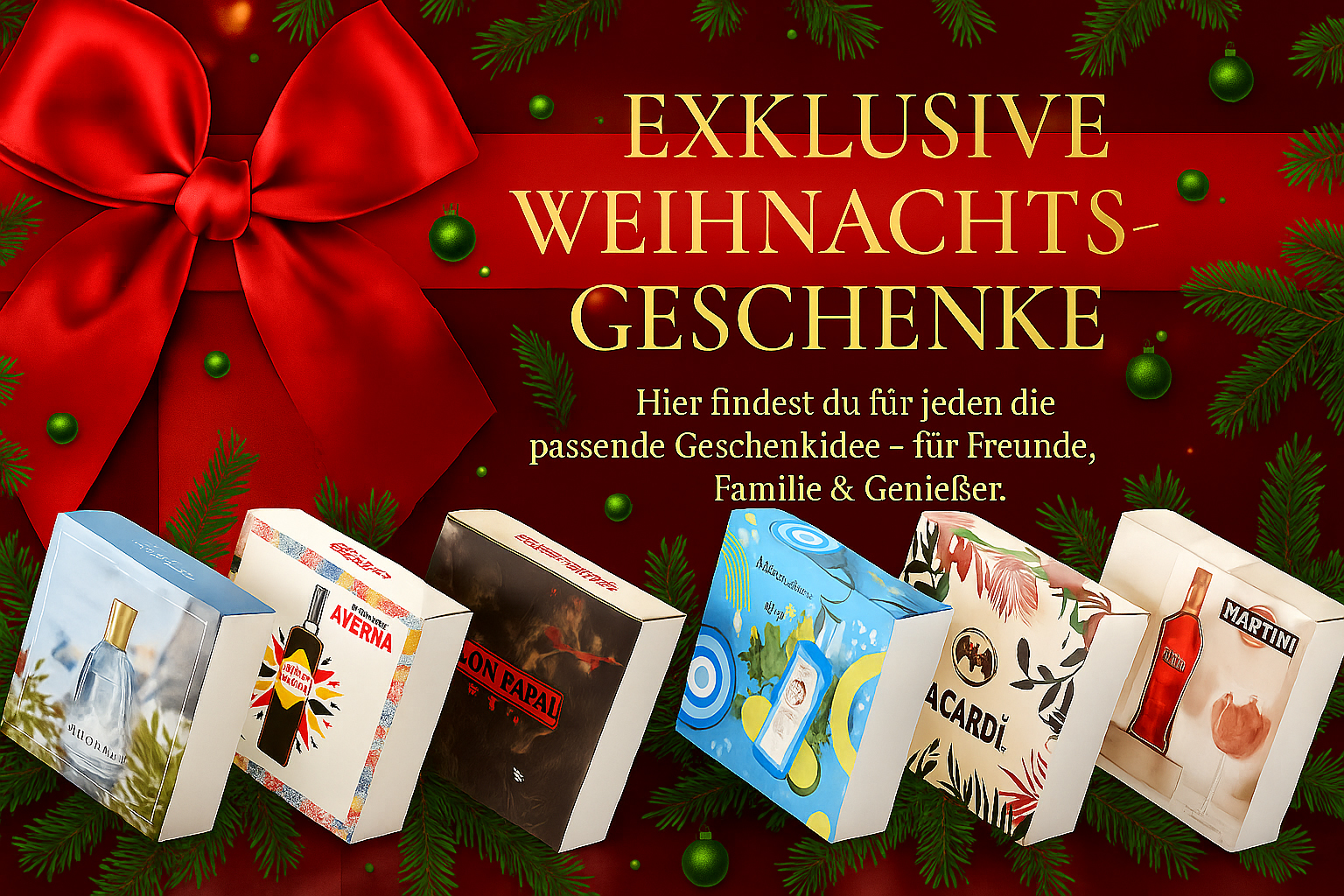 Entdecke unsere exklusive Auswahl an Geschenkideen, die jedes Weihnachtsfest bereichern: edle Marken-Sets in schönen Geschenkboxen, hochwertige Geschenksets für Genießer und unsere kreativen Eigenmarken wie Make Your Gin oder Make Your Whisky. Ideal für alle, die zu Weihnachten etwas Besonderes verschenken möchten.